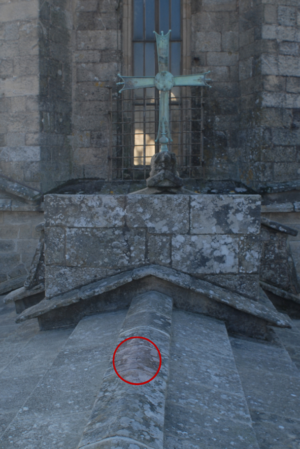 Consultando la página oficial de la catedral de Santiago www.catedraldesantiago.com, en visita virtual, en cubiertas P. Gelmírez, en el cuadro que se sitúa en el centro del altar mayor), podréis ver un vídeo de la cubierta de piedra. Si os molestáis en buscar, encontrareis una de ellas marcada con una cruz, que casualmente, y si mi tele-prospección es correcta, se sitúa sobre el Vórtice Energético.