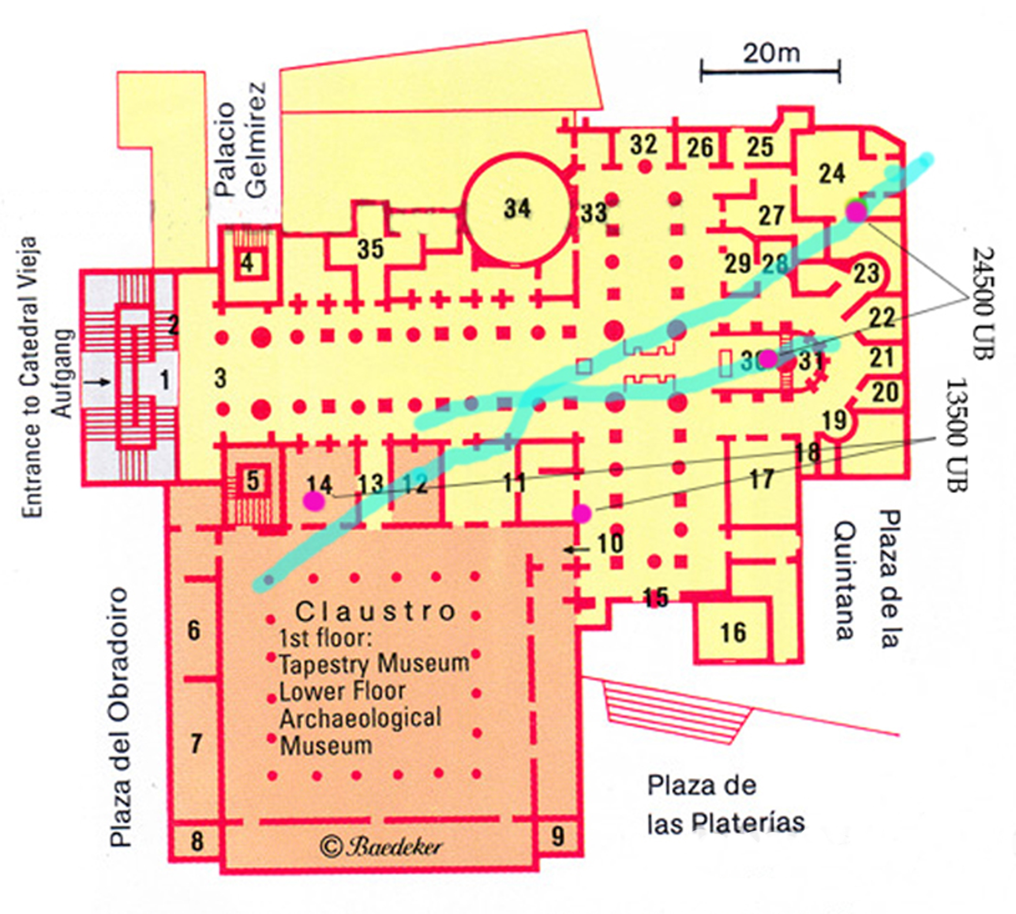 Existen dos Vórtices Energéticos de 24500 UB y dos de 13500 UB. Uno de los vórtices de 24500 ni siquiera pertenecía a la catedral, sino a la iglesia de Santa Mª la Antigua de la Corticela (que ya existía) y se anexionó a la misma como capilla de la Corticela. En esta capilla el vórtice de 24500 UB se encuentra a la derecha del altar, delante de la imagen del Niño Jesús de Praga (imagen del siglo XVIII), patrono de los tejedores. Por supuesto, no era la imagen que ocupaba ese lugar en el siglo XII. La vena de agua que atraviesa el punto la sitúo a unos 40 m. de profundidad, y se dirige hacia el confesionario nº 1. En la tele-prospección situé este punto en esta capilla, pero unos 3 m. hacia la izquierda, y la vena de agua en la dirección correcta.