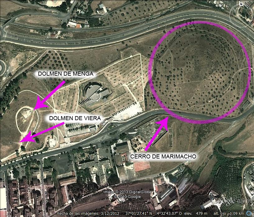 Para terminar con el tema de los dólmenes de Antequera, quiero decir que dentro del recinto donde se encuentran los dólmenes de Menga y Viera hay un cerro en el cual parece ser que se encontraron restos de un asentamiento, pues bien, en el cerro de Marimacho que es el que encierro en un círculo detecto un Punto de Meditación de 11500 UB, que está en un punto concreto y que en esta ocasión no señalo porque solo pasaré la información si la solicitan a las autoridades competentes, las posibilidades de que en ese lugar haya otro dolmen son muy elevadas, aunque no puedo asegurarlo, pero bastaría una pequeña cata en el lugar exacto para ver si se encuentra el relleno de piedra y tierra que suele formar el túmulo que cubre a un dolmen. El Punto de meditación nos marcaría sin lugar a dudas el centro de la cámara en caso de que ese dolmen exista.