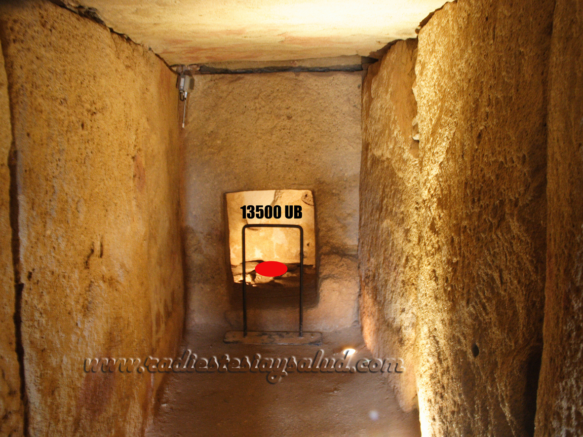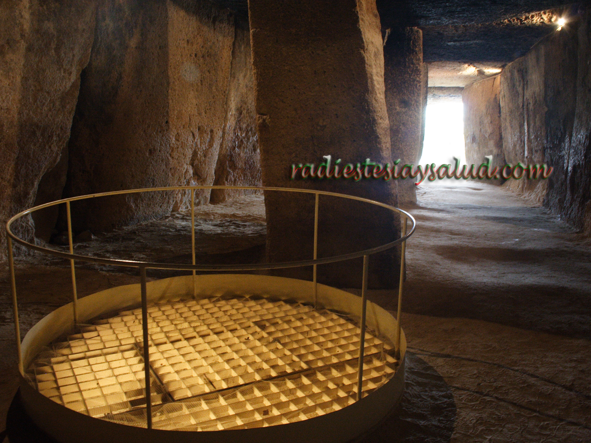 Este dolmen fue construido sobre un vórtice de 24500 UB, estos vórtices mayores siempre se dan en la confluencia de un cruce de líneas Hartamnn, un cruce de líneas Curry y una vena de agua, en este caso nuestros antepasados hicieron un pozo junto al vórtice, dentro del halo energético que yo he bautizado como Octógono Radiante, por lo tanto el agua contenida en este pozo es un agua con un nivel vibracional más alto, es decir, lo que se conoce como agua energizada, no es el único pozo que se hace en el interior de un dolmen, en la cripta de la catedral de Chartres en Francia aún se conserva un pozo que al parecer era utilizado por los druidas, a cuyas aguas atribuían cualidades curativas, no tengo duda de que su origen es anterior a ellos, el dolmen que existía junto al pozo fue destruido para construir la catedral sobre el vórtice de 24500 UB que aún sigue allí, el pozo de Los Fuertes, también se conserva. Una gran parte de los dólmenes orientan su corredor apuntando al este, en este caso no es así, tal vez consideraron una montaña sagrada la que se conoce como peña de los enamorados y le orientaron mirando a ella, desde este lugar este montículo rocoso se asemeja a la cabeza de una mujer en posición yacente. Por fin consigo visitar este dolmen, en el tercer intento, hace unos años ya dije al ver unas imágenes del dolmen que el tercer pilar, está clavado sobre el vórtice, al estilo de los menhires y dije también que situaba la vena de agua a unos 19 metros, al parecer así es, no dudo que hace unos miles de años el nivel del agua en el pozo sería mucho más alto, por desgracia, nuestros acuíferos están desapareciendo lenta pero inexorablemente, dentro de unos pocos años, tal vez décadas, los zahories, los verdaderos zahories, (ni están todos los que lo son, ni lo son todos los que dicen serlo) volverán a cobrar protagonismo porque el agua se convertirá en un valioso oro azul escaso y muy buscado.