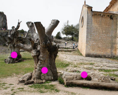 Vayamos con lo que llamó mi atención desde el principio y que prospecté antes de entrar en la ermita. Junto a ésta, hay tres inmensos troncos secos (centenarios sin duda); uno de ellos, víctima del leñador, se encuentra abatido. Resulta curioso observar que ningún árbol del entorno tiene una envergadura similar a estos.