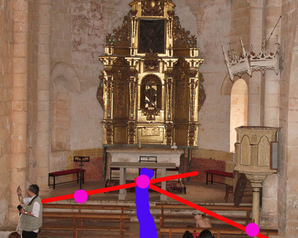Sigamos con la ermita. La construcción tiene forma de cruz latina, y su altar (situado en la cabecera de la misma) apunta hacia el Este. Todas las iglesias que yo he visitado y cuentan con un Ángulo Sacro se encuentran perfectamente alineadas con los puntos cardinales, el eje de su nave apunta al este situando su cabecera en esa orientación y el Ángulo Sacro se sitúa en el altar mayor, su vórtice central tras el altar en el lugar desde donde el sacerdote oficia la misa, el vórtice más cercano se solía situar justo delante del ambón o atril de lecturas, que dependiendo de su forma podría ir en una iglesias en la zona del evangelio y en otras en la zona de la epístola, en algunas de las iglesias, no en todas, el vórtice más separado coincidía con el púlpito, como en el caso de esta ermita, tres puntos energéticos situados estratégicamente para exaltar y potenciar la espiritualidad del oficiante. Hay un Vórtice Energético de 24500 UB, con su Octógono Radiante, que se sitúa justo donde está colocada la imagen de la Virgen de la Salud. El vórtice está frente al comienzo de la plataforma, la unión de estos cuatro vórtices es lo que yo he denominado Enclave Espiritual.