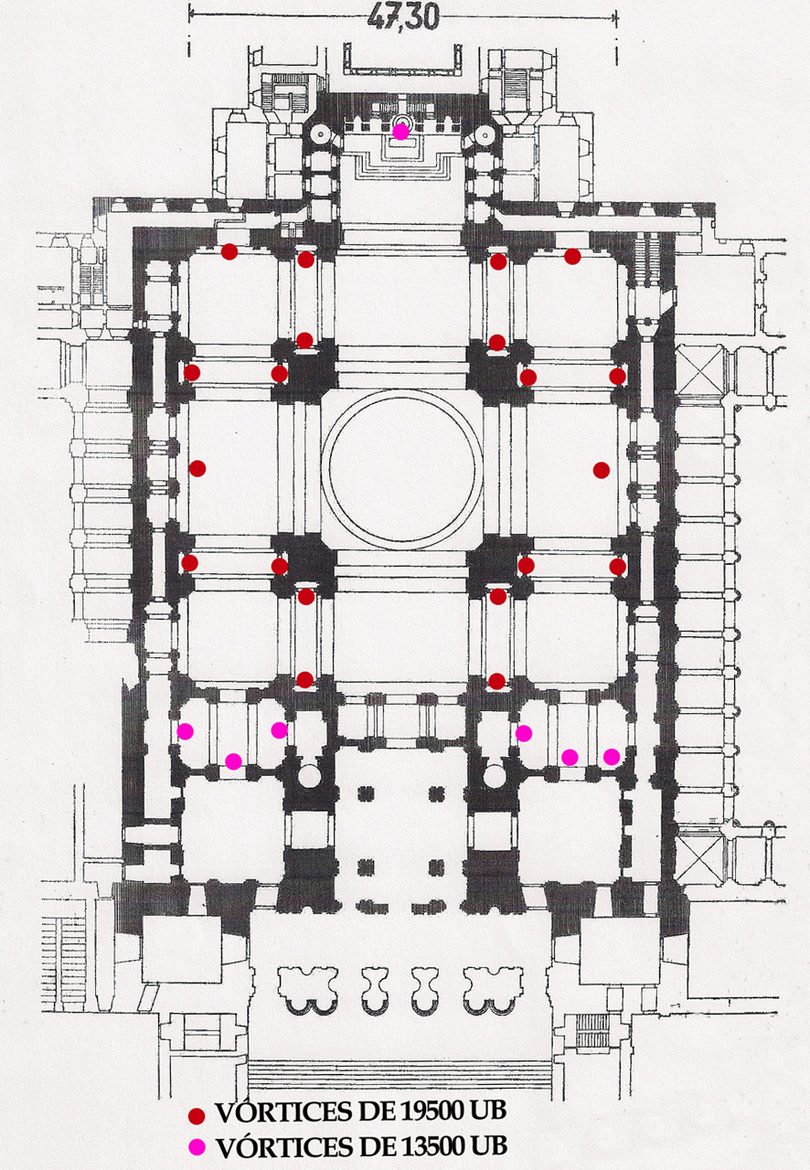Es posible que quien lea este artículo se interese por conocer el lugar exacto donde se encuentran situados estos 20 pilares de energía que son la base que sostiene la espiritualidad de la construcción. Resulta extremadamente sencillo encontrarlos. La basílica al final fue construida con planta de cruz griega, alejándose un poco de la idea original de Juan Bautista de Toledo, que la concibió con planta rectangular. Ya se encargó alguien de marcar debidamente los 20 vórtices de su interior para que no hubiese dudas.