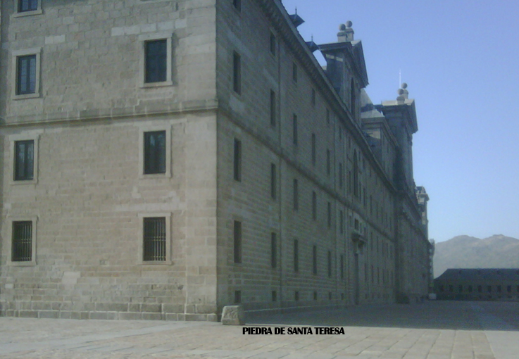 Para mí el más curioso de todos ellos se sitúa fuera de la edificación. Es la nota discordante del complejo. El defecto de la obra perfecta. Sin embargo hubo alguien que no quiso dejar este lugar en el olvido y lo marcó con un bloque de piedra. Se encuentra en la lonja junto a la esquina noroeste del edificio. La justificación parece ser comprendida y aceptada por todo aquel que visita el lugar: la piedra de Santa Teresa. Es llamada así porque supuestamente esta piedra fue utilizada por la santa para reponer fuerzas en una visita que hizo a Felipe II. Cuenta la leyenda que Dios quiso favorecerla con una ráfaga de viento fresco en pleno verano y que desde entonces siempre corre un viento fresco en este lugar; creo que demasiado fresco en invierno. Cierto o no, se convirtió en la excusa perfecta para dejar marcado el vórtice, aunque la piedra desentone en el conjunto.
