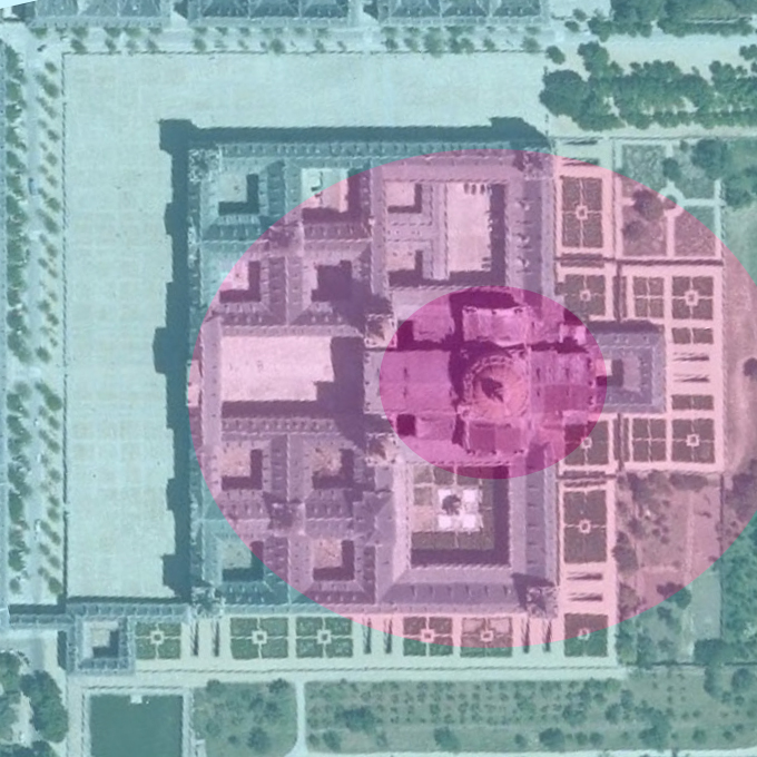 Lo que más extraño me resulta es encontrarme con tres vórtices de 24500 UB perdidos, es decir, en lugares que no indican para nada que fuesen detectados por la persona o personas que supieron detectar el resto con una precisión absoluta. Estos tres vórtices se encuentran en el Jardín de los Frailes. Uno de ellos empotrado en la esquina oeste de la pared de la fachada sur, construida por Juan Bautista de Toledo, y los otros dos en el jardín. Estos tres vórtices, sin más, habrían justificado el hecho de construir en este lugar tan magna obra. Solamente estos tres vórtices tan cercanos entre sí convertirían la zona en un Lugar de Poder. Sin embargo, fueron excluidos de la obra. Quiero pensar que no fueron detectados, que la potencia del lugar, eclipsó la percepción del geomante que se encargó de localizar el resto de los vórtices. A estos los dejaré seguir en el olvido.