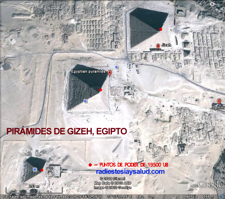 Al llegar a El Cairo, y más concretamente a la meseta de Gizeh, al hacer mi pregunta, el péndulo me señaló cuatro puntos con una energía superior a las 13500 UB. Tres de ellos correspondían a las pirámides, y me marcaba un cuarto situado a una distancia de unos 3,5 Km. en dirección sureste. El cuarto vórtice no tuve la oportunidad de visitarlo para poder prospectarlo físicamente y poder comprobar si se encontraba en el interior de algún templo o simplemente estaba aún por descubrir.