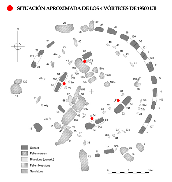 Antes de viajar al Reino Unido, volví a tele-prospectar sobre un plano el templo de Stonehenge marcando la situación de los 4 vórtices de 19500 UB y las tres venas de agua que surcan el lugar. Siempre debajo de un Vórtice Energético de rango mayor hay una vena de agua, en este caso una pasa por dos de ellos. También marqué la densidad energética de los tres anillos, quería comprobar después sobre el terreno si mi tele-prospección difería de la realidad.